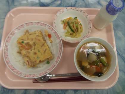 駒込中の親子丼は、ふわふわした大きな卵焼きを1枚、ご飯の上にのせます。卵焼きの中には、鶏肉、人参、玉葱等の親子丼の具材が入っています。皆さんの好きな味付けのようで、きちんと食べられていました。味噌ドレッシングサラダは甘酢味の味噌ドレッシングで和えた和風サラダです。けんちん汁には、豆腐、野菜、鶏肉などが入り、具だくさんの汁物となりました。今日も、野菜たっぷりの献立となりました。
