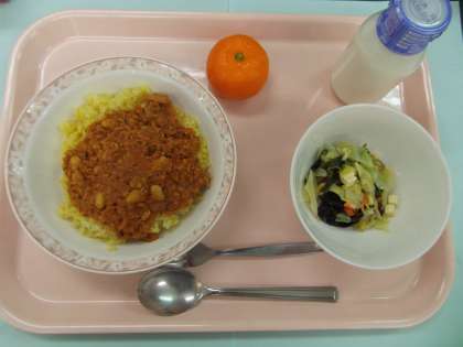 チリビーンズライスは、カレー粉とトマト味を生かした大豆入りのミートソースを、カレー粉で味付けしたご飯にかけます。スパイシーな味付けですが、それが好評のようでよく食べています。大豆は存在感を出すためにあえて丸ごと使用します。海藻とチーズのサラダは、海藻とチーズが入ることでカルシウムたっぷりのサラダになります。今日は大豆も使用し、カルシウムたっぷりな洋食メニューとなりました。食べやすい料理でした。