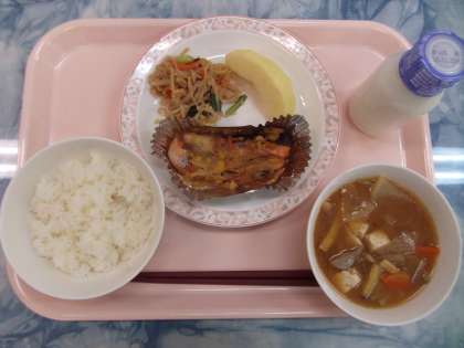 鮭のちゃんちゃん焼きは、鮭を焼いた上に、味噌味をベースとした野菜炒めをのせて、さらに焼きました。北海道の郷土料理です。味噌味がよくきいているため、白いご飯によく合うおかずとなりました。切り干し大根、さつま汁には野菜たっぷりです。切り干し大根、ごぼう、こんにゃくなどはかみ応えも十分あり、かみかみ献立となりました。さつまいもも使用し、食物繊維たっぷりな和食献立となりました。