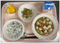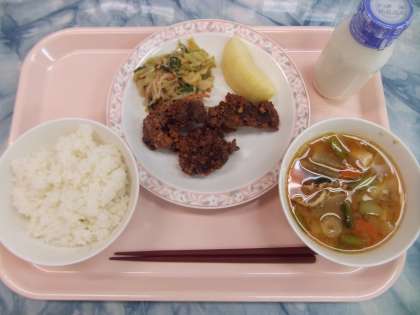昔の給食では、よく使われていた鯨肉を使った料理です。鯨肉は昔はよく使われていました。今日は鯨肉をにんにく、しょうが、りんご等のすりおろした調味液につけ込み、揚げました。よく食べていました。珍しい物なので興味もあったようです。野菜のおひたし、豚汁なども具だくさんでした。野菜もきちんと食べましょう。