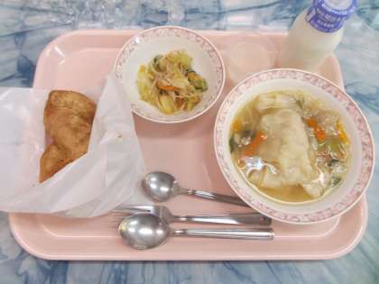 皆さんの好きな料理の組み合わせです。きなこ揚げパンは、食べやすいようにねじりパンを油で揚げ、きなこをまぶしました。からっと仕上がり、完食でした。わんたんスープは生わんたんの皮で挽肉を包み、具だくさんのスープに入れました。給食室で手作りしたわんたんは、柔らかく仕上がりました。揚げパンとわんたんはよくある組み合わせです。昔懐かしい給食を感じられました。じゃこサラダは、ちりめんじゃこの風味を感じられるサラダです。こちらもよく食べていました。