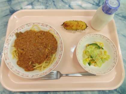 学校のスパゲティーミートソースは、野菜や大豆がたくさん入ったミートソースです。濃厚な味付けですが、ヘルシーな食材をたくさん使用しています。ミートソースも昔からある学校給食の献立のひとつです。よく食べていました。スイートポテトは今回は牛乳を多く使用し、ねっとりとした仕上がりになりました。こちらも好評でした。