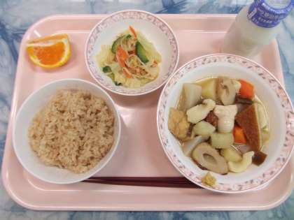 おでんと茶飯は定番の組み合わせです。まだまだ寒い日が続いています。おでんは冬のヘルシーな鍋物です。野菜、芋類、こんにゃく、昆布、卵、練り製品などたくさんの具材が入ります。色々食べて体を温めましょう。果物はデコポンです。2月から3月にかけての果物です。少しずつ春は近づいています。