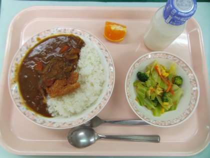明日に都立入試を控えての応援献立です。カツ(勝)飯を食べて、頑張りましょう。皆さんの大好きなカレーと組み合わせました。よく食べていました。果物は、はるかという柑橘類でした。給食室からも応援しています。また、来週からの学年末考査も、皆さん頑張りましょう。