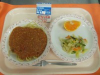 みぞれスパゲティーは、大根おろしにツナを加え、だし汁としょうゆ等を使用したソースをかける、和風味のスパゲティーです。きざみのりをかけていただき、あっさりとしています。日本ならではのスパゲティーです。大根をたくさん使用しました。ごまだれサラダは、練りごまとにんにくを使用したドレッシングで和える、少し濃厚な味付けのサラダです。スイートポテトは、給食ならではの程よい甘さでおいしくいただきました。