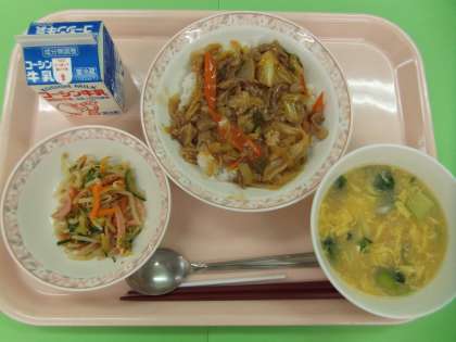 回鍋肉丼は、たくさんの野菜と豚肉を使用し、ピリ辛味噌味で味付けした野菜炒めをご飯の上にかけます。豆板醤やにんにくを効かせた料理はご飯が進みます。野菜をたくさん使用するのですが、かさが減り、好きな味付けなので、よく食べてくれました。暑いときに食の進む料理の一品です。中華和えはもやしときゅうり、ハムなどが入った甘酸っぱい中華サラダです。口当たりよくいただきました。中華風卵スープは、クリームコーンを使用し自然な甘味を生かした、さっぱりしたスープでした。