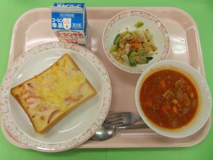 クロックムッシュは、玉葱とハムの入ったホワイトソースを食パンの上にのせて、ピザチーズをかけて焼きました。濃厚な仕上がりです。フランス発祥のようです。チリコンカンは、チリパウダー効かせた少しスパイシーなトマト味の豆の煮込み料理です。アメリカ料理です。いんげん豆を使用しました。乳製品、豆類など、カルシウムたっぷりの洋風献立でした。