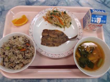 ひじきご飯には、枝豆、鶏肉、油揚げ等が入り、具だくさんな味付けご飯となりました。煮物では食べにくい人も、ご飯に混ぜると食べられるのではないでしょうか?鰯の梅肉味噌焼きは、練り梅をベースにみりん、味噌等を合わせたたれをのせて焼きました。骨まで食べられます。ひじきご飯、魚ともカルシウムたっぷりです。味噌汁には、かぼちゃが入りました。かぼちゃからの自然な甘味が感じられました。