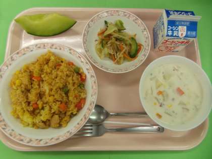メキシカンピラフは、トマトとカレー味をベースにチリパウダーを使用し、少しスパイシーに味付けしたピラフです。香辛料と香味野菜の風味が効いた、食欲のそそるピラフでした。コーンチャウダーには、じゃがいもや、ベーコン、えび等も入りまろやかに仕上がりました。スパイシーなピラフと合いました。果物は甘いメロンでした。彩りも良く、夏らしい献立でした。