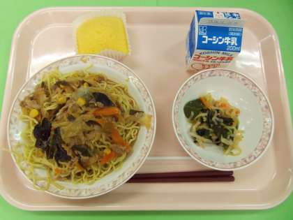 みそラーメンは、豚肉、キャベツ、もやし、コーン、きくらげ、にら、人参等が入った具だくさんなスープをかけます。にんにく風味のピリ辛の味噌味で、皆さんの好きな味付けなので良く食べてくれました。大根サラダには、わかめやツナが入りました。中華味のサラダでした。マーラーカオは卵や生クリームをたくさん使用した濃厚な蒸しパンです。こちらは別腹のようでした。