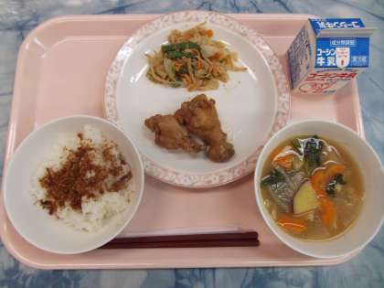 ふりかけごはんは、かつおぶしとごま、ちりめんじゃこをから煎りし味付けしたおかかふりかけです。カルシウムもたっぷりで、ご飯が進みました。鶏肉のさっぱり煮は、鶏手羽元をしょうゆ、酢、にんにく、しょうがで合わせたたれで、約2時間煮込みました。肉はとても軟らかくなりました。余計な脂肪分も落ち、コラーゲンが豊富です。酢を使用しているのでさっぱりとしていて、夏らしい料理でした。よく食べていました。実だくさん汁には、さつまいも、根菜類、葉物野菜などが入り、具だくさんな味噌汁となりました。