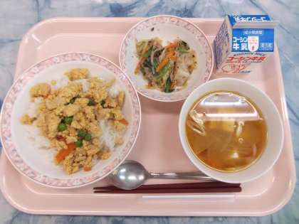 試験最終日で久しぶりの給食になります。親子丼は和食ですが、親しみ易い料理で、ほっとする味付けです。試験明けなので、ほっとできる料理に心がけました。梅肉和えは、練り梅の酸味がきいた野菜のお浸しで、人気の高い料理です。蒸し暑い日が続くので練り梅の酸味が、さわやかに感じられました。汁物には野菜や豆腐がたくさん入りました。