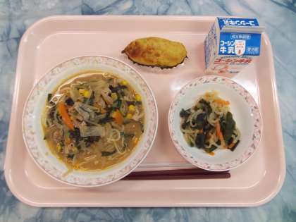 みそラーメンは、豆板醤やにんにくをきかせた、具だくさんの汁をかけていただいます。具だくさんなので素材からのうま味成分も出て、いい味に仕上がりました。とても好評でした。大根サラダはわかめとツナを加え、あっさりとしたサラダに仕上がりました。秋が旬のさつまいもをたくさん使用し、大きなスイートポテトが仕上がりました。秋らしい献立でした。