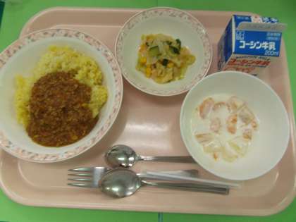 今週から全学年が揃い、賑やかになりました。駒中のドライカレーライスには、ごぼうや大豆のみじん切りが入ります。ドライカレーにすると、こうした食材が苦手な人でも食べられるようです。香辛料もきかせたので食べやすくなり、よく食べてくれました。イタリアンサラダは、にんにく風味を効かせたサラダで、コーンも入りました。フルーツヨーグルトは、フルーツ缶詰をプレーンヨーグルトで和えた、さっぱりしたヘルシーなデザートです。全体的に食べやすいメニューでした。