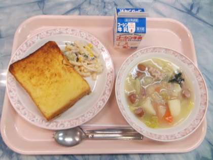 フレンチトーストは、卵・牛乳・バター・バニラエッセンス・砂糖で作った卵液に、食パンを浸して焼きます。程よい甘さで食べやすく、人気の料理です。野菜と肉のたくさん入ったポトフと一緒に頂きましょう。マカロニサラダは、ツナやコーンも入りマヨネーズで和えた物で、こちらも食べやすいサラダでした。食べやすいメニューの組み合わせで、きちんと食べられていました。
