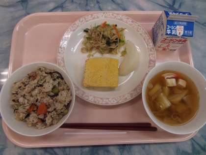 ひじきや人参、鶏肉等の味付けした煮物をご飯に混ぜた和風ご飯です。煮物では食べにくいひじきでも、五目ご飯のようにすると食べやすくなるのではないでしょうか。千草焼きは鶏肉や人参、玉葱等を混ぜ込んだ具だくさんの甘い卵焼きです。甘い卵焼きは好きなようです。彩りよく野菜のお浸しをつけました。お浸しやけんちん汁には野菜がたくさん使用されました。果物は梨で、さっぱりといただきました。