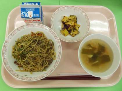 ソース焼きそばは、ウスターソースと中濃ソースを使用して、肉や野菜を炒め、中華麺と混ぜ合わせました。久しぶりのソース焼きそばの提供です。学校では肉や野菜がたくさん入るので、かさが増えますが、皆さんよく食べていました。わかめスープは、野菜や豆腐が入りさっぱりと仕上がりました。大学芋はかりっと揚がり、甘くて秋らしいデザートになりました。