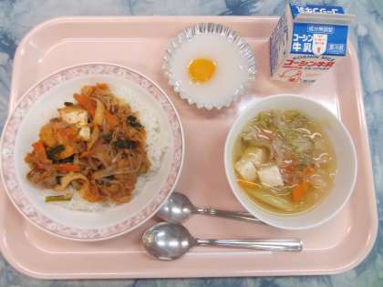 豚キムチ丼は、白菜キムチと豚肉、玉葱、人参、もやし等をキムチの味をベースに炒め、ご飯の上にかけます。キムチの辛さは、キムチの汁で調節しました。キムチの辛さを和らげるために、生揚げも入りました。白米が進みました。中華スープには、野菜、鶏肉、豆腐、ザーサイ等を入れ、さっぱりとした味付けに仕上げました。目玉焼きゼリーは、杏缶を黄身に見立て、カルピスゼリーで白身を演出しました。甘酸っぱい口直しのデザートでした。