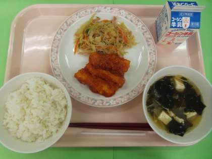 いかのチリソースは、20gのいかの切り身が、1人あたり3本つきます。ケチャップや豆板醤、チリソースを使用した少々スパイシーな味つけは好きなようです。よく食べていました。バンサンスーは、千切り野菜と春雨、ハムなどが入った中華風サラダです。口当たりよく食べられます。わかめスープには、豆腐や鶏肉も入りました。日本人に親しみ易い中華料理の組み合わせでした。