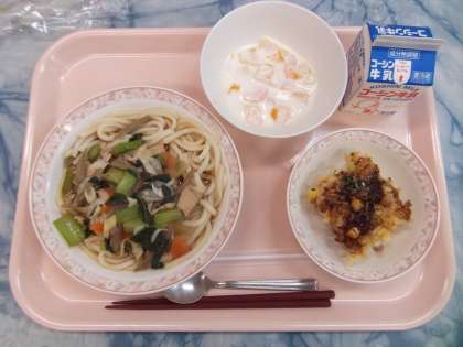 今日は午後からの骨密度・貧血授業に備えて、カルシウムや鉄分たっぷりのメニューにしました。かみかみお好み焼きは、さきいか、桜エビ、豆腐、チーズ等が入っているところがポイントです。豆腐が入ることで、もっちりとした食感も味わえます。蛋白質、カルシウム、鉄分などが十分に補えるお好み焼きでした。野菜もたくさん入っています。久しぶりのお好み焼きで、よく食べていました。けんちんうどんは根菜類が豊富に入ったうどんで、よく噛んで食べられるうどんでした。
