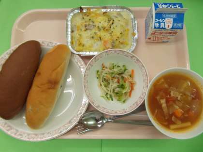 パンリザーブは、レーズン:ココア=約1:3の割合でした。生徒にはココア味が人気のようです。職員は約2:1の割合でレーズンの方が多かったです。どちらも甘いパンでした。ポテトグラタンはじゃがいもとマカロニ、コーンなどが入ったボリュームのある濃厚なグラタンでした。好きな料理のようでよく食べていました。大根サラダには、かにかまぼこが入りさっぱりと仕上がり、ミネストローネは、トマト味でいんげん豆の入った具だくさんなスープでした。