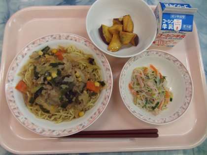 みそラーメンは、駒中生より多くのリクエストをいただいたメニューです。肉や野菜、コーンなどがたくさん入った具沢山のスープをかけます。具沢山なスープのため、体の温まる一品です。キャラメルポテトは、さつまいもを素揚げし、バターと砂糖で作ったキャラメルソースに絡めました。シナモンも少々加えました。洋風の大学芋のようなデザートです。よく食べていました。