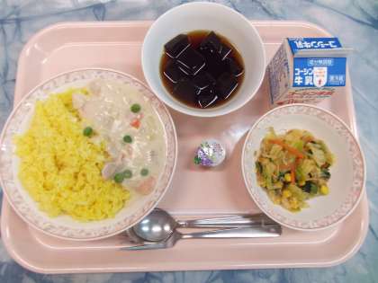 ピラフのクリームソースかけは、ターメリックライスに牛乳、バター、チーズなどを使用して作ったクリームソースをかけていただきます。鶏肉やえびが入っています。濃厚なクリームソースとご飯がよく合い、食べやすい料理です。カラフルサラダは、りんごや玉葱をすりおろしたドレッシングで野菜を和えます。小松菜、コーン等も入るので、色がカラフルになります。コーヒーゼリーは、ほろ苦さが少し残るゼリーですが、シロップとポーションクリームで苦さが和らぎ食べやすくなります。人気メニューです。