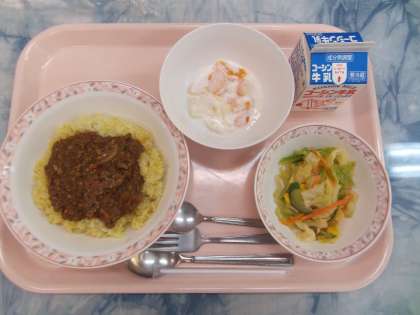 駒中のドライカレーは、ごぼうや大豆のみじん切りが入っていて、ヘルシーなドライカレーです。みじん切りにすることで、野菜や豆が苦手な人でも食べられるようで、生徒たちはよく食べます。イタリアンサラダは、にんにく風味をきかせたサラダです。フルーツヨーグルトはさっぱりしたヘルシーなデザートでした。食べやすい献立で、野菜もたくさん使用しました。