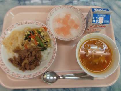 ビビンバ風ご飯は、韓国風の焼き肉と野菜のナムルをご飯の上にのせ、一緒に食べる韓国の料理です。駒中生からのリクエスト献立です。甘辛くにんにく風味で味付けした焼き肉と、さっぱりした野菜のナムルが白いご飯によく合います。又、白菜キムチを使用した少々ピリ辛いスープもご飯をすすめてくれました。今日は韓国料理献立でした。アセロラゼリーとカルピスゼリーを合わせた紅白ゼリーは、酸味がきいていてさっぱりとしています。見た目もかわいいデザートでした。
