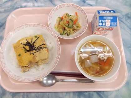 開花丼とは、親子丼の肉を鶏肉ではなく、豚肉にした料理です。「他人丼」とも言います。甘辛く味付けした、大きな柔らかい卵焼きを1枚、ご飯の上にのせます。卵焼きにしっかり味がついているので、ご飯が進みます。梅肉和えは、練り梅を使用した野菜のお浸しで、駒中生には、人気のある料理です。けんちん汁には、葉物野菜、根菜類、じゃがいも、こんにゃく、豆腐、鶏肉などを入れ、具沢山な汁物になりました。