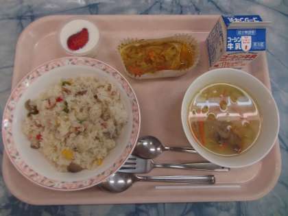 ピラフには、ハム、コーン、グリンピース、赤ピーマン、マッシュルーム等が入りました。シンプルな味付けですが、カラフルに仕上がりました。魚のマヨネーズ焼きは、カジキマグロに、カレー粉とマヨネーズで作ったソースをかけ焼きました。食べやすい魚料理のようでよく食べていました。野菜スープは野菜を沢山使用したスープで、いつものサラダの代わりになりました。ミルクゼリーにはいちごを加え、見た目にもかわいらしいデザートになりました。