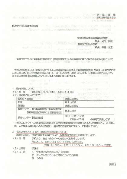 保護者会の予定等については、5月12日配布のプリントの通りです