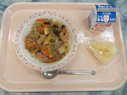 一皿できちんと栄養をとれるように、中華丼には、野菜類、豚肉、海産物、きくらげ等を加え、具沢山などんぶりになりました。中華丼は色々な種類の野菜を使用するので、たくさん野菜を摂取できるのが魅力的です。果物は冷凍の洋梨がつきました。