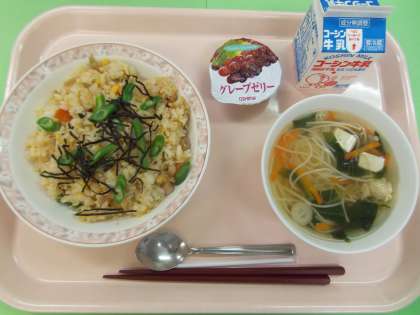 7月7日、七夕を御祝いした献立で、ちらし寿司と七夕汁を提供しました。ちらし寿司には、ごぼう、かんぴょう、油揚げ、鶏肉等が入り、具沢山なちらし寿司になりました。七夕汁はすまし汁にそうめんを加え、天の川に見立てました。さっぱりとした献立で、見た目が華やかな和食献立となりました。