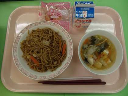 ソース焼きそばは、中濃ソースとウスターソースで味付けした皆さんのなじみのある料理です。給食では、野菜と肉がたくさん入っています。中華スープは白菜、わかめ、豆腐、玉葱、ねぎ等が入り、さっぱりとした具沢山なスープになりました。親しみやすいメニューでした。