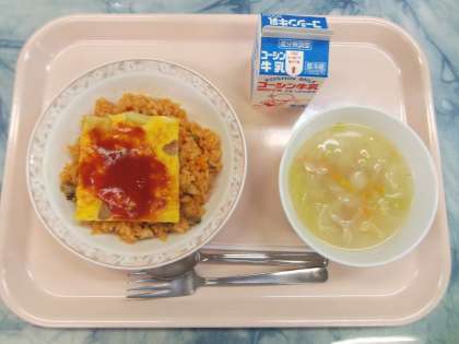 オムライス風ご飯は、チキンライスと卵焼きを一緒に頂くご飯です。ご飯と卵がよく合う組み合わせで、食べやすいこともあって、好評でした。野菜スープには、キャベツ、玉葱、コーン、人参、ベーコン等が入りました。