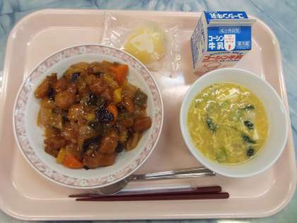 駒中の酢豚には豚肉の他、玉葱、人参、ピーマン、きくらげ、じゃが芋等が入り、具沢山な酢豚です。肉を沢山使用しますが、同時に野菜類も沢山使用するので、肉も野菜類も一緒に摂取できます。酸味をきかせてあるので食べやすく、白いご飯によく合います。卵スープは、とうもろこしを使用した少々甘みのある中華卵スープでした。