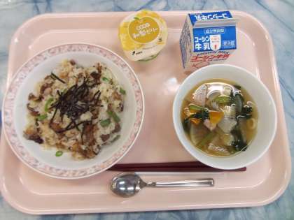 土用の丑の日にちなんで、短冊切りにした秋刀魚の蒲焼きをご飯に混ぜて、提供しました。秋刀魚の蒲焼きは、給食室で油で揚げ、甘辛いタレに絡めました。ご飯に混ぜ、甘辛い味付けご飯になったので、食べやすくなったようです。初の試みでしたがよく食べていました。これから暑くなる夏に備えて、スタミナをつけましょう。けんちん汁には鶏肉、野菜類、こんにゃく、豆腐等が入りました。