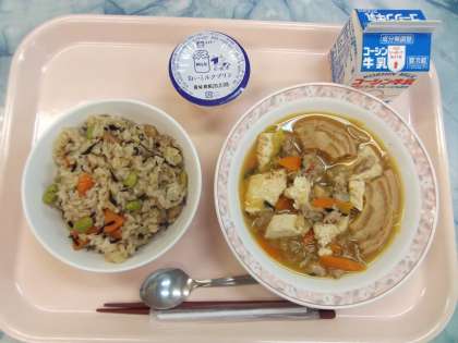 ひじきご飯は、甘辛く味付けしたひじき煮を、ご飯に混ぜます。鶏肉や枝豆も入ります。煮物より、食べやすいのではないでしょうか?肉豆腐は、豚肉と焼き豆腐をメインにした野菜の煮物で、今回は車麩も加えてみました。具沢山な野菜の煮物になりました。親しみやすい味付けでした。