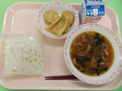 今回の五目うどんは、大根、玉葱、人参、油揚げ、鶏肉などが入った、けんちん風の五目うどんです。野菜類がたくさん摂取できるように心がけました。さつまいもの天ぷらは、ほっくりとした食感で、甘くて人気です。キスの天ぷらと一緒に食べましょう。