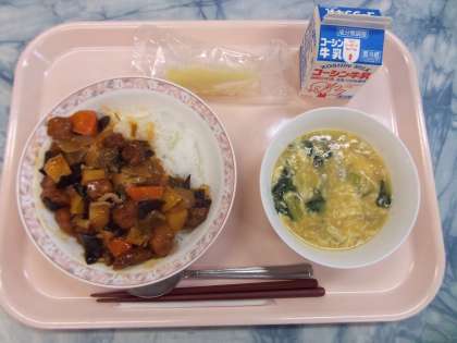 酢豚には、豚肉、じゃがいも、玉葱、人参、しめじ、きくらげ、ピーマン等が入っています。衣をつけて揚げた豚肉、素揚げしたじゃがいも等はボリュームがありますが、野菜やきのこ類もたくさん入っていて、様々な食品を摂取することができました。卵スープは、とうもろこしや豆腐も入り、中華風に仕上げました。