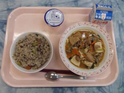 ひじきご飯は、甘辛く味付けしたひじき煮を、ご飯に混ぜました。鶏肉、枝豆、油揚げ、人参等も入っています。ひじきの煮物に比べると食べやすいようです。ひじきにはカルシウムがたくさん含まれています。肉豆腐は、焼き豆腐と豚肉をメインとした、野菜の煮物です。玉葱、人参、小松菜、車麩等も入りました。デザートにはミルクプリンがつき、カルシウムがたくさん摂取できる和食献立になりました。