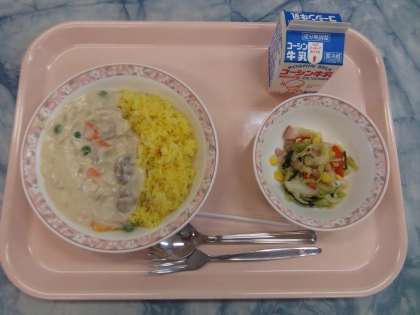 ピラフのクリームソースかけは、ターメリックライスに、ほたて、いか、鶏肉等が入ったクリームソースをかけていただきます。粉チーズや生クリームも使用し、濃厚な仕上がりです。食べやすい料理のようで、よく食べていました。野菜ソテーには、キャベツ、小松菜、コーン、パプリカ等が入り、色鮮やかな野菜ソテーになりました。