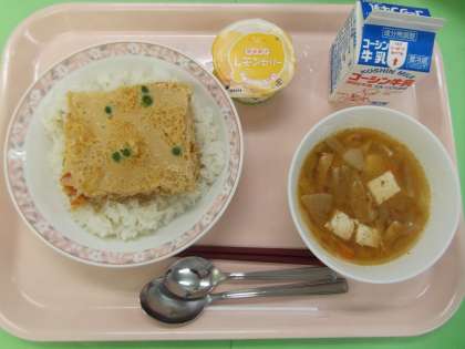 親子丼は生徒の食べやすい和食料理です。鶏肉、卵、玉葱、人参等をたくさん使用しています。甘辛い味付けで、白飯が進む料理です。みそけんちん汁には、ごぼう、大根、人参、豆腐、油揚げ、ねぎ等が入りました。どちらも親しみやすい料理で、よく食べていました。10/7
