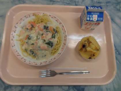 サーモンクリームスパゲティーは、秋が旬の鮭をたくさん使用し、生クリームや粉チーズを加え、濃厚なクリームソースに仕上げました。きのこも入り、秋らしいスパゲティーになりました。明日の10月10日、「目の愛護デー」にちなんで、目に良い食材と言われている、ブルーベリーをたくさん使った、マフィンケーキを作りました。よく食べていました。