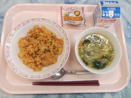 キムチチャーハンは、キムチの風味をきかせた食欲の進む料理で、駒中生の人気料理の一品です。キムチの辛さは、キムチの汁の量の加減によって調節します。青菜の中華スープは、青梗菜、キャベツをメインとした、野菜スープで、鶏肉や豆腐も入りました。具だくさんなスープになりました。