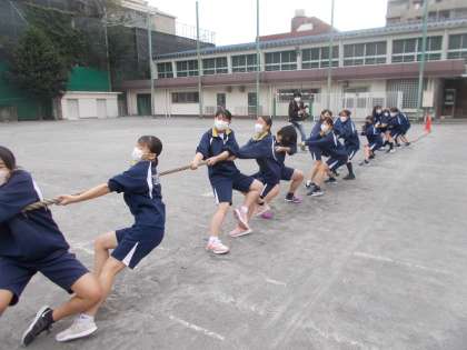 種目は、ソーシャルディスタンス玉入れ、ソーシャルディスタンス綱引き、全員リレーの3つでA組とB組が競いました。どの競技にも一生懸命取り組み、白熱したものになりました。特に、最後の全員リレーではアンカーまで勝負がもつれる大接戦でした。結果は、B組が優勝しました。