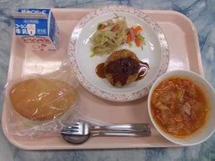 明日のハロウィンにちなんで、かぼちゃ料理の提供です。かぼちゃコロッケには、ハムやチーズを加えました。好みでパンに挟んで食べます。かぼちゃの自然な甘みを感じられるコロッケに仕上がりました。野菜と一緒に食べましょう。トマトスープはキャベツ、人参、玉葱、セロリー、ベーコン、いんげん豆、マカロニ等が入り、具だくさんでトマトの酸味を生かしたスープになりました。マカロニも入ったのでボリュームがありました。10/30
