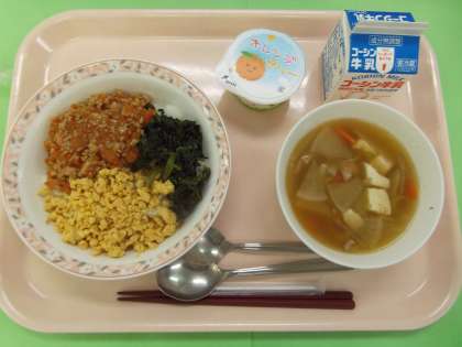そぼろご飯は、甘く味付けした炒り卵、甘辛い味付けの鶏そぼろ、小松菜煮浸しをご飯の上にのせていただきます。甘辛い味付けは生徒の好きな味付けで、よく食べていました。親しみやすい和食料理です。けんちん汁には、鶏肉、根菜類、葉物野菜、こんにゃくなどが入り、具だくさんな汁物になりました。