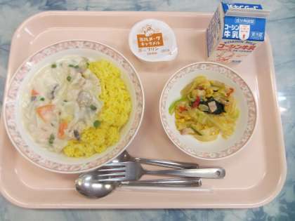 ピラフのクリームソースかけは、ターメリックライスに鶏肉や帆立貝柱の入ったホワイトソースをかけていただきます。濃厚なソースの仕上がりで、生徒の好きな味付けです。野菜ソテーは、コーン、パプリカ、小松菜等を使用したため、色鮮やかなソテーに仕上がりました。